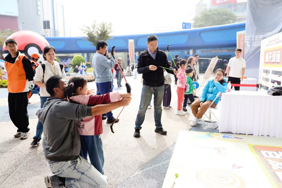 运动项目的设置兼顾趣味性与普适性,真正实现老少皆宜。无人机足球虽未纳入打卡任务,却凭借新奇体验成为市民驻足围观的焦点;眼疾手快项目中,参与者紧盯掉落的杆子随时准备抓取,紧张刺激的氛围引得围观者阵阵欢呼;跳绳以完成30次为目标,无需计时的规则让不同年龄段市民都能轻松参与;高尔夫、飞盘、射箭等项目则降低了专业门槛,其中“百发百中”射箭打卡任务最受小朋友追捧,不少孩子拉着家长反复体验。
